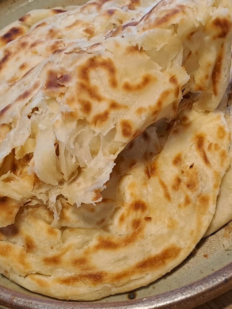 The trick to creating the flaky texture is to ‘beat’ the roti with some wooden spatulas once cooked to separate the layers and create the flakiness. These breads should be eaten immediately as they don’t stay fresh and flaky for long. I’ve tried freezing them but the result is poor – always make fresh.